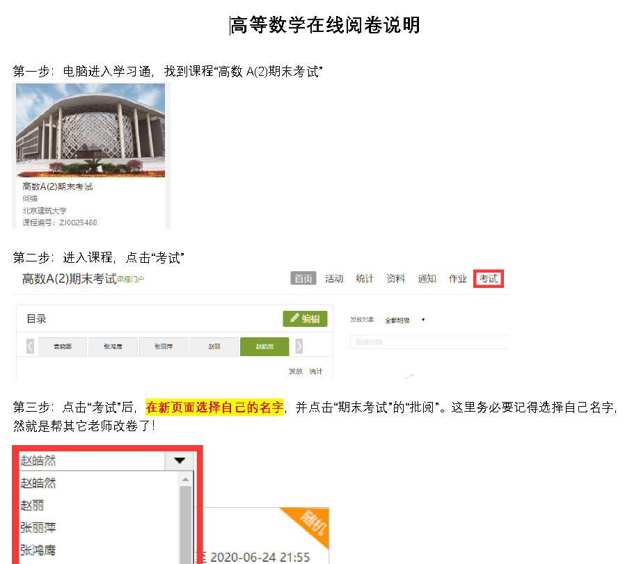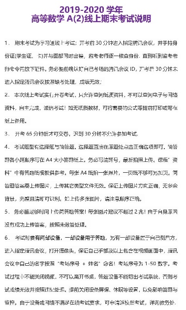 其次,高等数学线上期末考试共安排了三十个考场,每个考场安排了一位主监考教师。教学团队不仅对监考老师发布了监考说明,进行了核查身份、线上监控、定时提醒等培训,而且要求所有监考老师以学生身份参与了模拟考试,确保他们熟悉学生线上考试的全过程,并能够及时处理考试中的各种偶发事件。