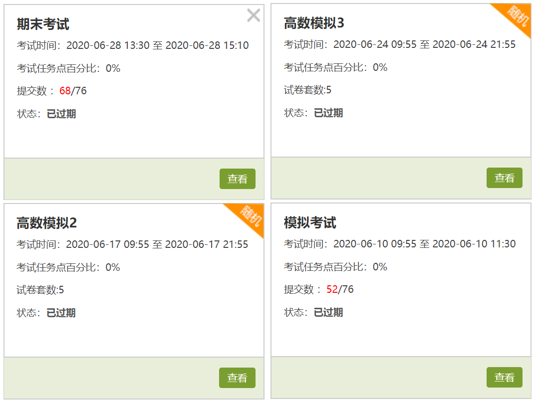 首先,为了延续高等数学改革中的考教分离,出题小组教师与教学团队经过反复研讨,确定了线上考试的试卷题型,并通过学习通与微信群向学生发布了线上考试注意事项,涵盖了从签到、开考、答题到交卷等考试过程中所有环节的重要事项。为确保线上考试的顺利进行,教学团队分别于6月10日、17日和24日进行了三次模拟考试,让学生对题型、题量进行反复演练,一方面让学生检验了自己的复习效果,另一方面让学生熟悉线上考试的全流程。