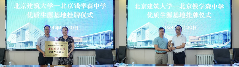 毛发虎代表我校向北京钱学森中学授予“优质生源基地”牌匾,黄鹤向中学赠予我校制作的雕塑作品“纽带”。
