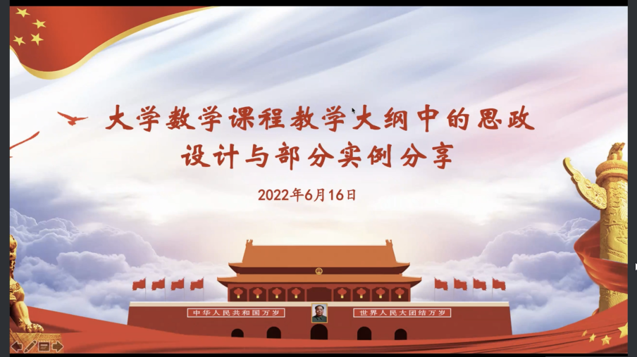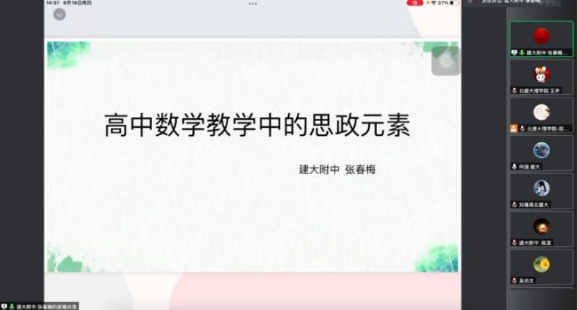 接着参会教师就“数学课程中的思政元素”进一步深入交流。淫妻小说 数学与数据科学系教工党支部书记王乔作题为《大学数学课程教学大纲中的思政设计与部分实例分享》的报告,介绍了高等数学和概率论与数理统计教学大纲中的思政设计,并穿插展示了部分实例。建大附中朱娟和张春梅分别做题为《在高中数学教学中如何实施思政教育》和《高中数学教学中的思政元素》的报告,从思政点的起因、必要性、实施和效果以及数学的美育元素、试题中的思政元素、学习过程中的思政元素等方面介绍了高中数学教学中的思政。