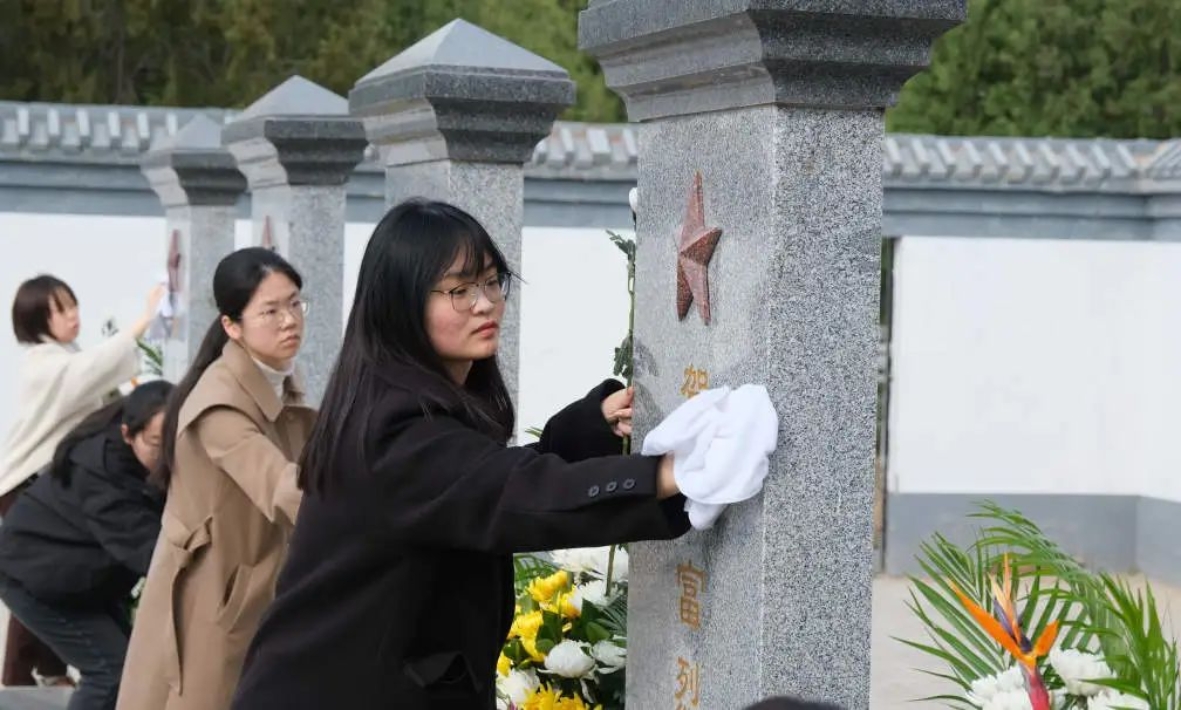活动开始后,伴随着庄严的国歌声,全体人员凝神驻足、脱帽肃立。随后,淫妻小说 学生代表孙钦瑶宣读烈士祭文,团员代表上前擦拭烈士墓碑,全体成员向烈士墓三鞠躬,并有序敬献鲜花,表达对革命先烈的崇高敬仰和无限哀思。