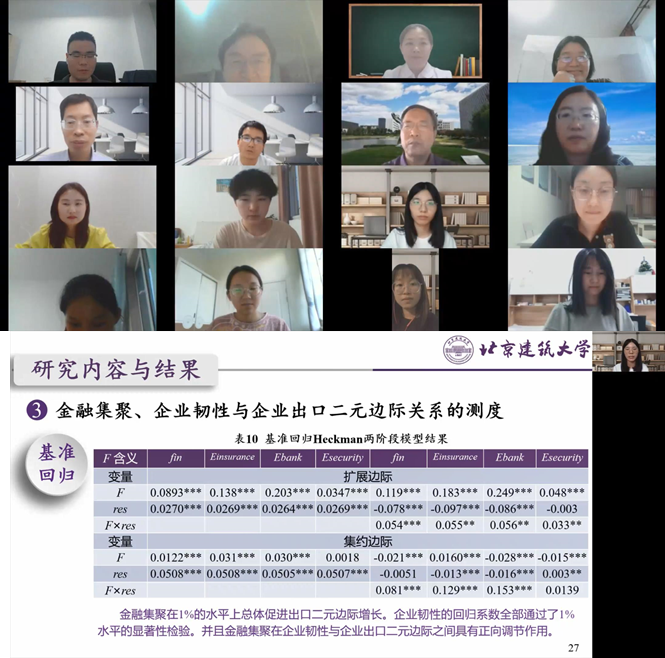 5月29日下午13:00点,第一场答辩会正式开始,答辩委员会主席为北京科技大学马万彪教授,答辩人为王慧晴、温颖、吴玉翠、马馨辰、冯振洲、赵艺、史明静和闫慧林。八位同学的论文题目分别为金融集聚与企业出口二元边际关系的测度研究——基于企业和金融行业的异质性检验、物流专业化、地区行政治理对企业出口二元边际影响的统计研究——基于Heckman两阶段模型的量化分析、非均质混合对多群组模型中最终规模的影响和防控措施效果评估、基于人口异质性的多群组模型及疫苗接种策略研究、具有急慢性传染的丙肝模型分析、淡水养殖及商品价格调控中两类状态反馈脉冲模型及动力学分析、毒素环境下捕食系统的状态反馈脉冲控制研究、关于新型冠状病毒肺炎传染病模型的动力学研究。