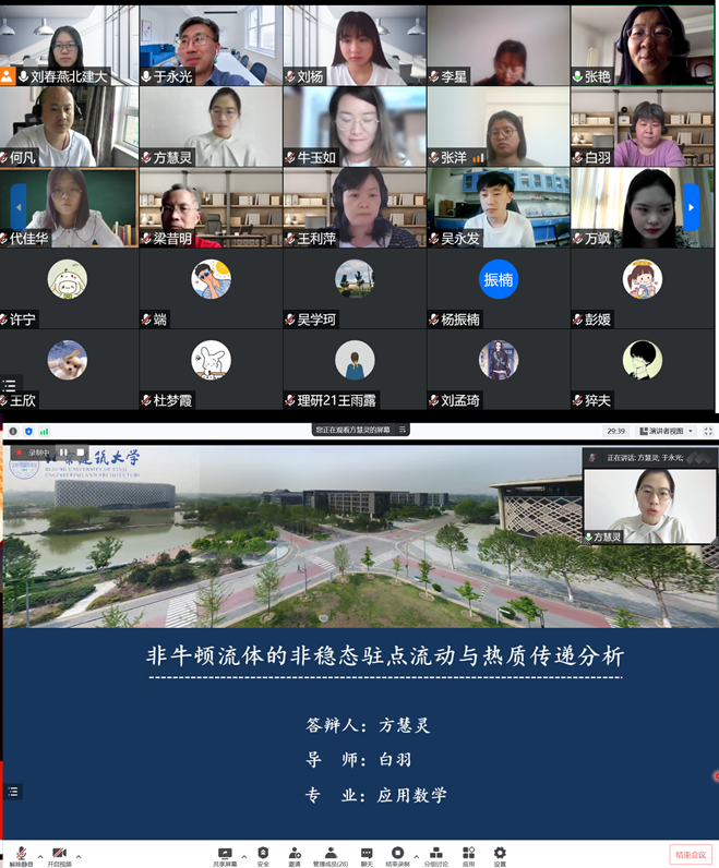 第二场答辩会于6月1日下午14:00开始,会议由答辩委员会主席北京交通大学于永光教授主持。八名答辩研究生方慧灵、张洋、牛玉如、万飒、代佳华、吴永发、李星、刘杨的汇报题目分别为非牛顿流体的非稳态驻点流动与热质传递分析、蜘蛛猴优化算法的改进及其应用、多孔室内建材中VOCs、甲醛的反常扩散研究、分数阶粘弹性流体的非稳态驻点流动问题研究、C3型仿射Weyl群最低双边胞腔上的Kazhdan-Lusztig系数、两类复杂流体的流动传热传质研究、灰狼优化算法的改进及应用研究、高超音速边界层的流动传热分析。